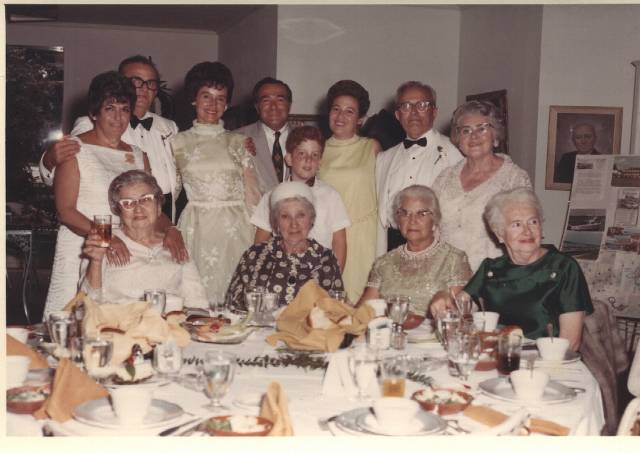 the first picture with unidentified old people is at my parents wedding, August 1969. On the top row from left to right is Poppy's sister, Aunt Rose/Roz, Cousin Georgie to Grammy's right, then Sylvia Georgie's wife; on bottom row: Aunt Helen, Gramma in Trenton aka Aunt Gussie, Aunt Julia (Gramps' older sister), Aunt Celia