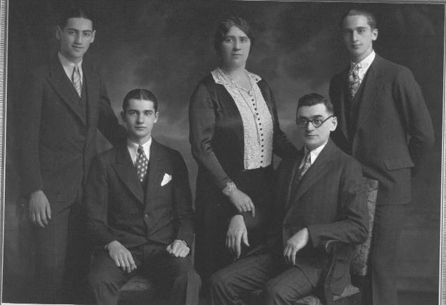 the black and white photo of unidentified people is from left to right Julius, Davie, Gussie, Uncle Louie, Maxie. Uncle Louie was Nanny's older brother, Gussie was his wife, and their three sons. Maxie was a prize fighter, Maxie married Gertie. The sons are a little older than Grammy and Aunt Bid.